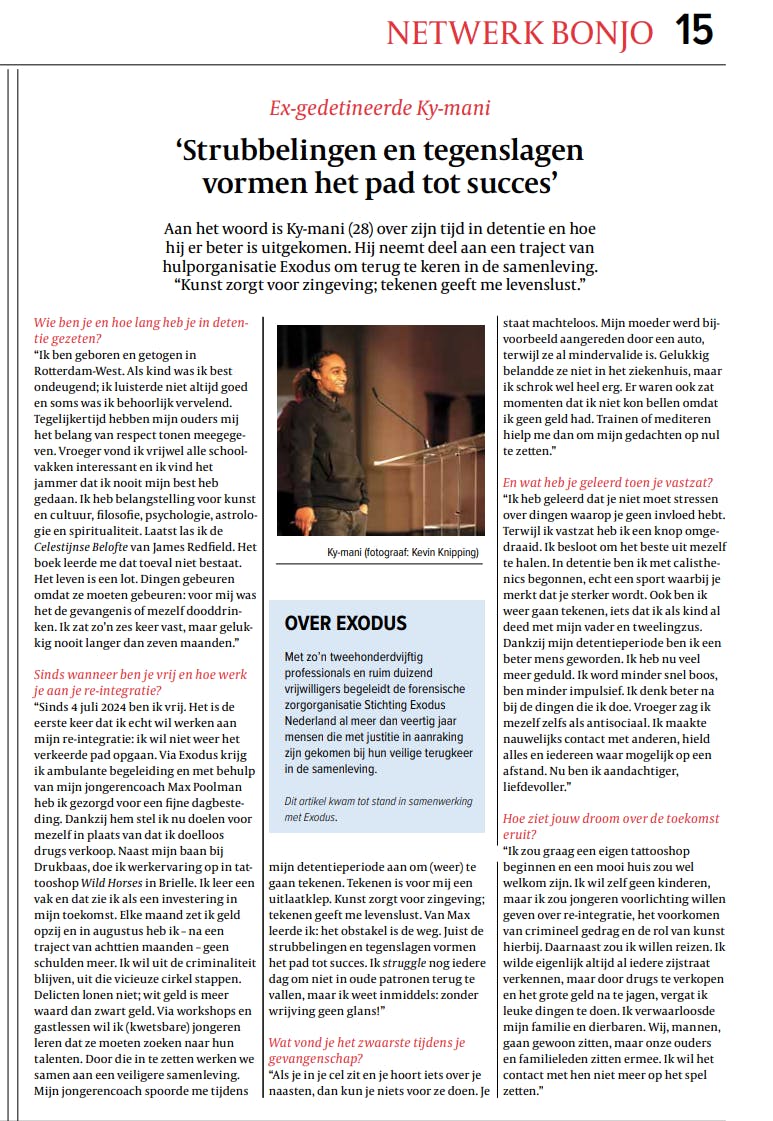 “Sinds 4 juli 2024 ben ik vrij. Het is de eerste keer dat ik echt wil werken aan mijn re-integratie: ik wil niet weer het verkeerde pad opgaan. Via Exodus krijg ik ambulante begeleiding en met behulp van mijn jongerencoach Max Poolman heb ik gezorgd voor een fijne dagbesteding. Dankzij hem stel ik nu doelen voor mezelf in plaats van dat ik doelloos drugs verkoop. Naast mijn baan bij Drukbaas, doe ik werkervaring op in tattooshop Wild Horses in Brielle. Ik leer een vak en dat zie ik als een investering in mijn toekomst. Elke maand zet ik geld opzij en in augustus heb ik – na een traject van achttien maanden – geen schulden meer. Ik wil uit de criminaliteit blijven, uit die vicieuze cirkel stappen. Delicten lonen niet; wit geld is meer waard dan zwart geld. Via workshops en gastlessen wil ik (kwetsbare) jongeren leren dat ze moeten zoeken naar hun talenten. Door deze in te zetten werken we samen aan een veiligere samenleving. Mijn jongerencoach spoorde me tijdens mijn detentieperiode aan om (weer) te gaan tekenen. Tekenen is voor mij een uitlaatklep. Kunst zorgt voor zingeving; tekenen geeft me levenslust. Van Max leerde ik: het obstakel is de weg. Juist de strubbelingen en tegenslagen vormen het pad tot succes. Ik struggle nog iedere dag om niet in oude patronen terug te vallen, maar ik weet inmiddels: zonder wrijving geen glans!”